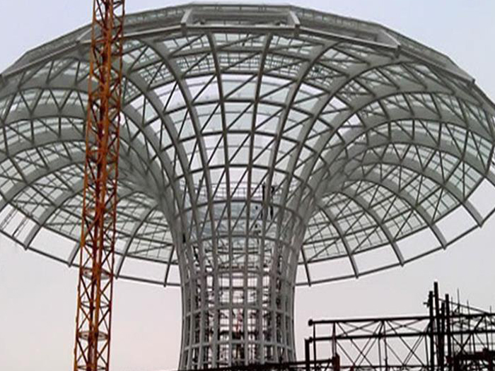 二、球形网架结构因其结构新颖,受力合理,自重轻、用钢量低等优点。如大型体育场馆球形海口螺栓球网架、公共场馆球形网架、电厂海口螺栓球网架、水泥工业球形网架、仓储物流球形网架、海口干煤棚工业球形网架、海口收费站海口加油站球形网架、展览中心、影剧院、商场、航站楼、候车厅、工厂海口车间、仓库、电视塔等球形螺栓球节点网架。国内球形网架结构主要分为:海口焊接球节点网架及螺栓球节点网架两种。螺栓球节点网架其构件工厂内加工量较大,现场安装便捷,适用于现场工期紧,海口施工条件、用电量受制约,网架形状复杂、海口杆件定位困难的异形结构。螺栓球节点球形网架系统基本由海口杆件、螺栓球、支撑支座等组成。按照节点形式可分为交叉海口桁架体系、四角锥体系、三角锥体系等。支撑方式多为固定支座支撑。对于大面积、大跨度及有特殊受力或伸缩要求的网架结构可采用橡胶支座、滑移支座、球铰支座等支撑形式,以满足结构自身的受力稳定、均衡,便于内力释放等设计要求。